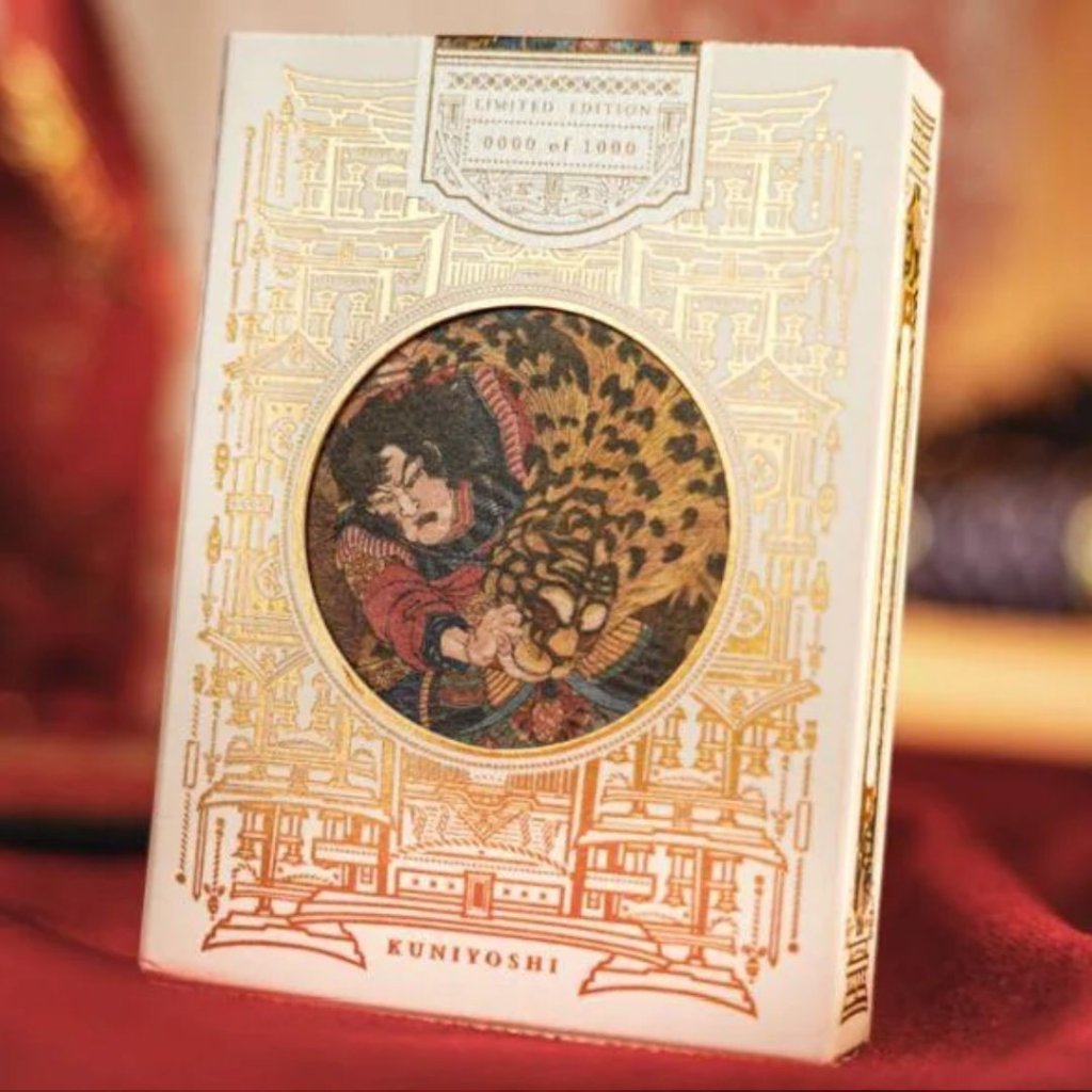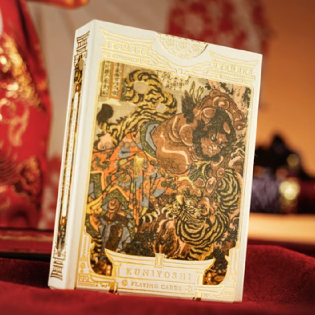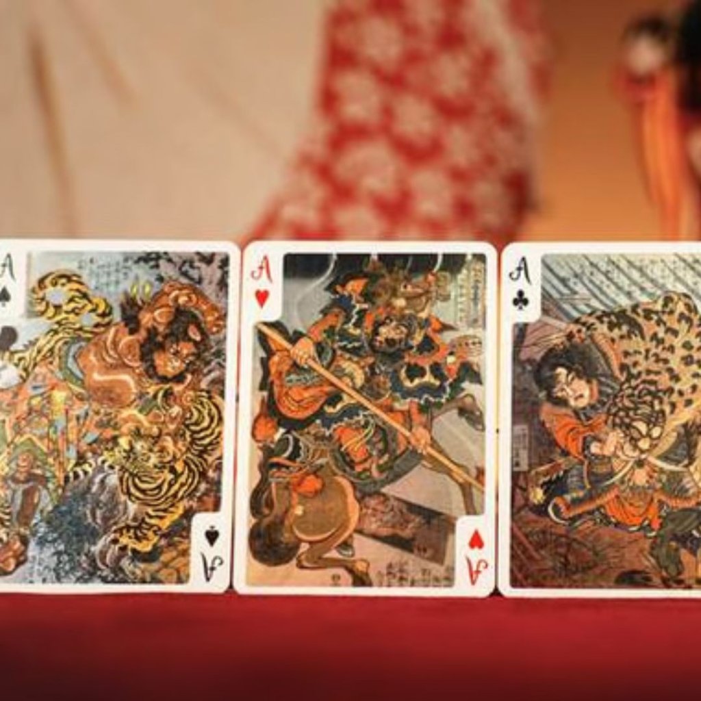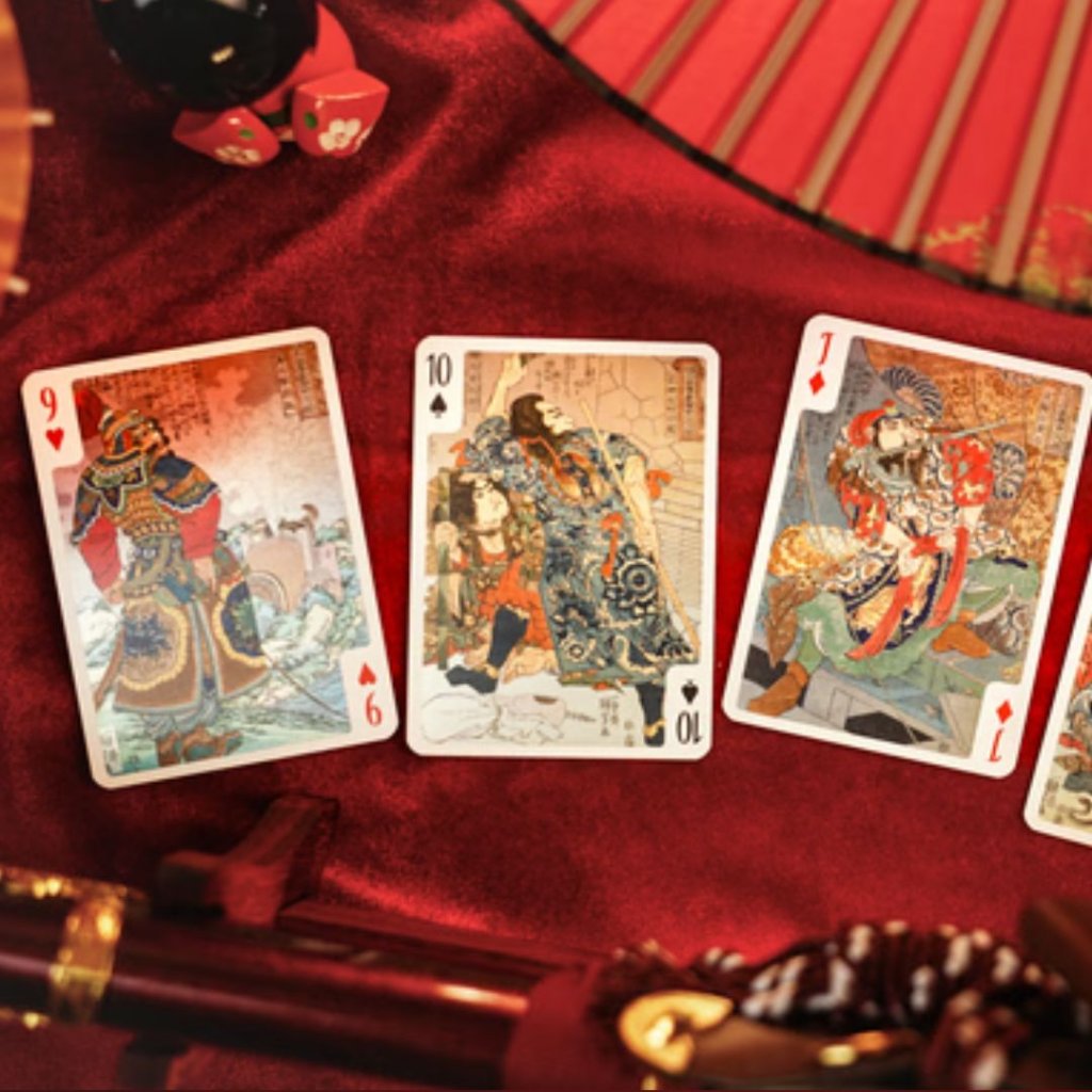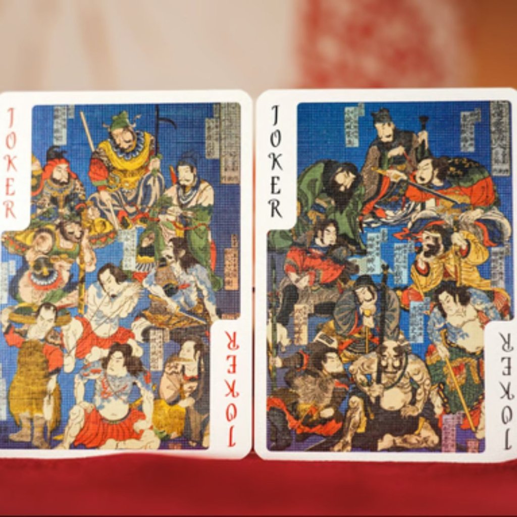 這套牌組展示了歌川國芳職業生涯中的標誌性浮世繪作品,包括他的《水滸傳》英雄系列、武士插圖以及各種妖怪(超自然生物)描繪。