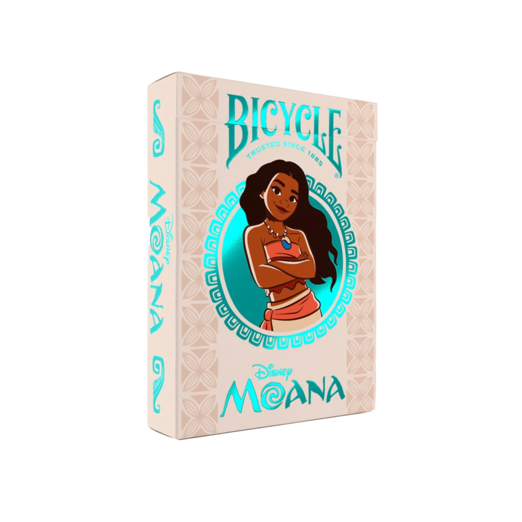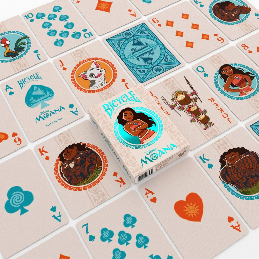 下次遊戲之夜,就用 Bicycle 出品的迪士尼《海洋奇緣》主題撲克牌,開啟前往 Te Fiti 的海上冒險之旅吧!牌盒裡有莫阿娜、毛伊,還有「船上小吃」——小雞 Hei Hei 和小豬 Pua!
