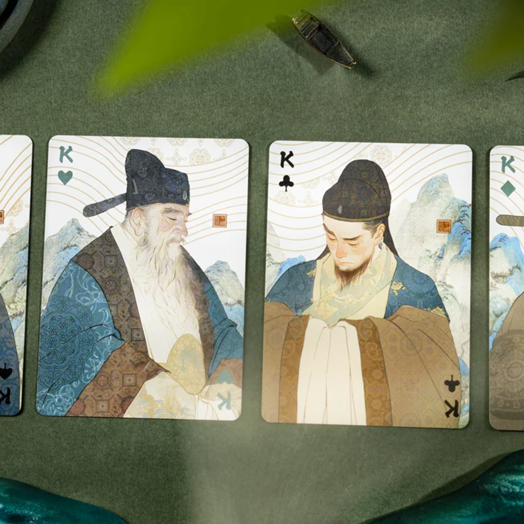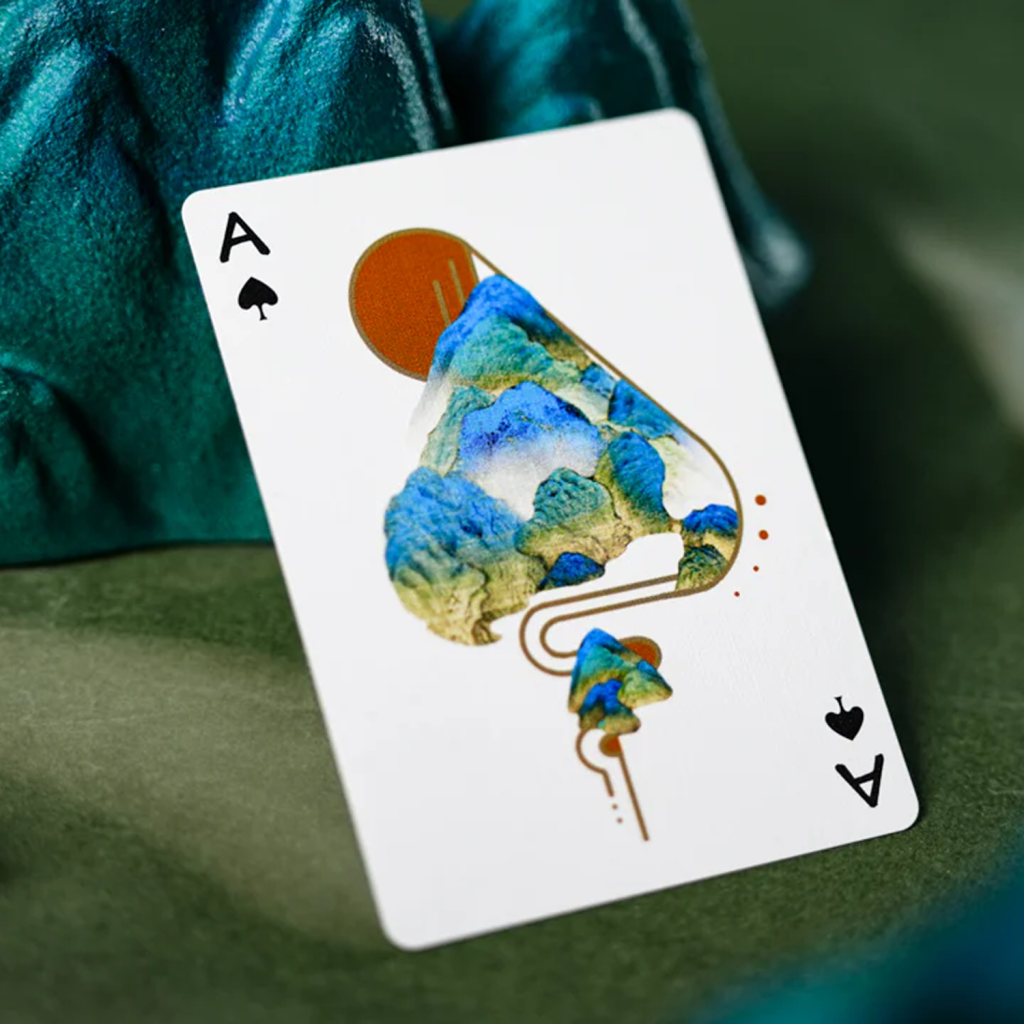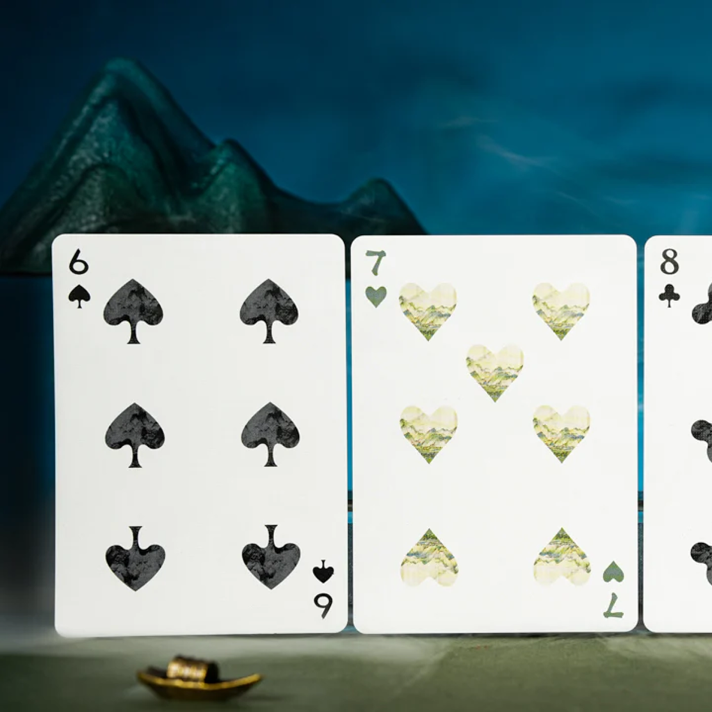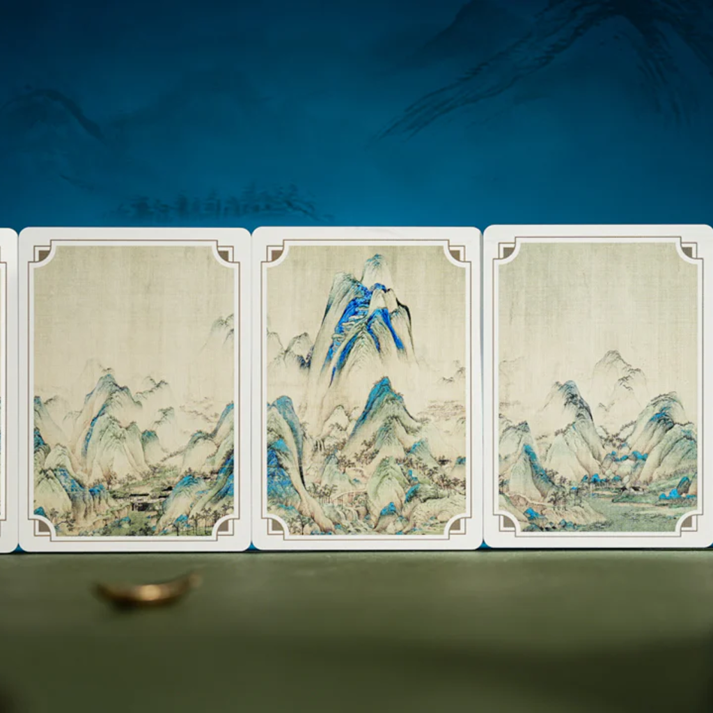 當按順序排列時,每個花色的卡背組合在一起形成一幅完整的山水畫。卡背上的細微皺褶和痕跡呼應了這幅畫作數百年的歷程,喚起獨特而豐富的永恆氛圍。