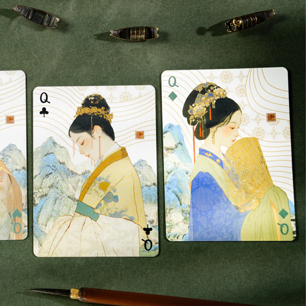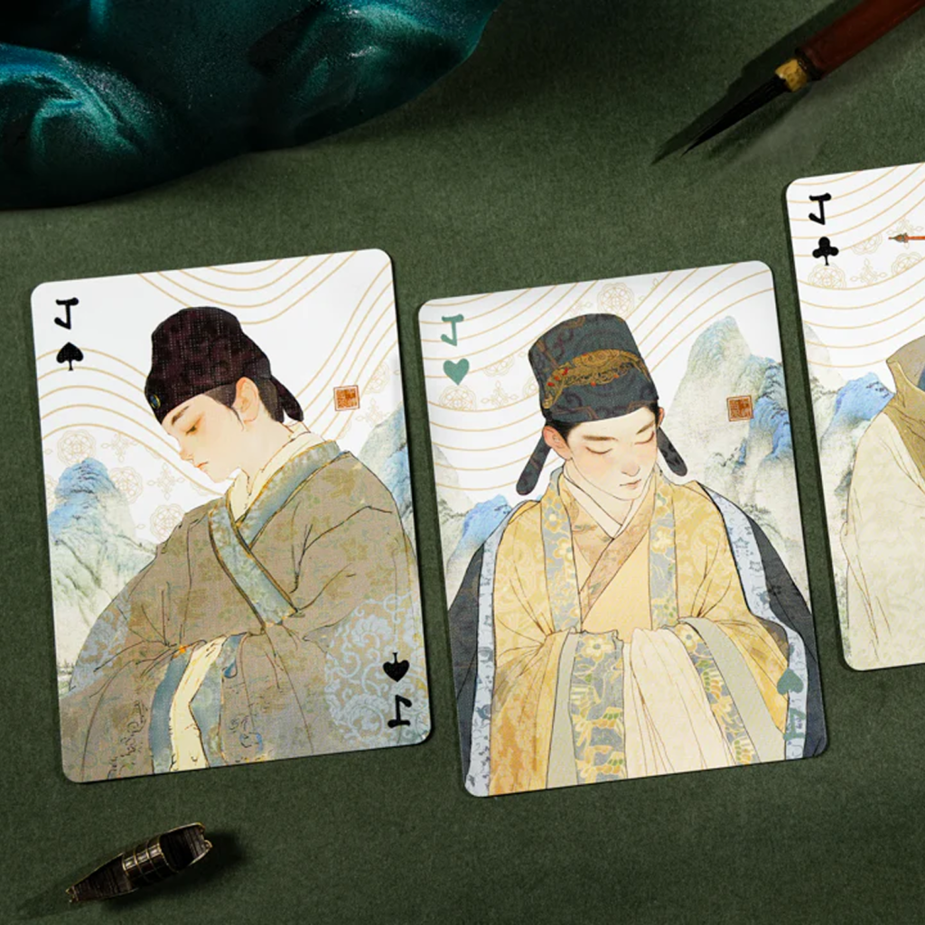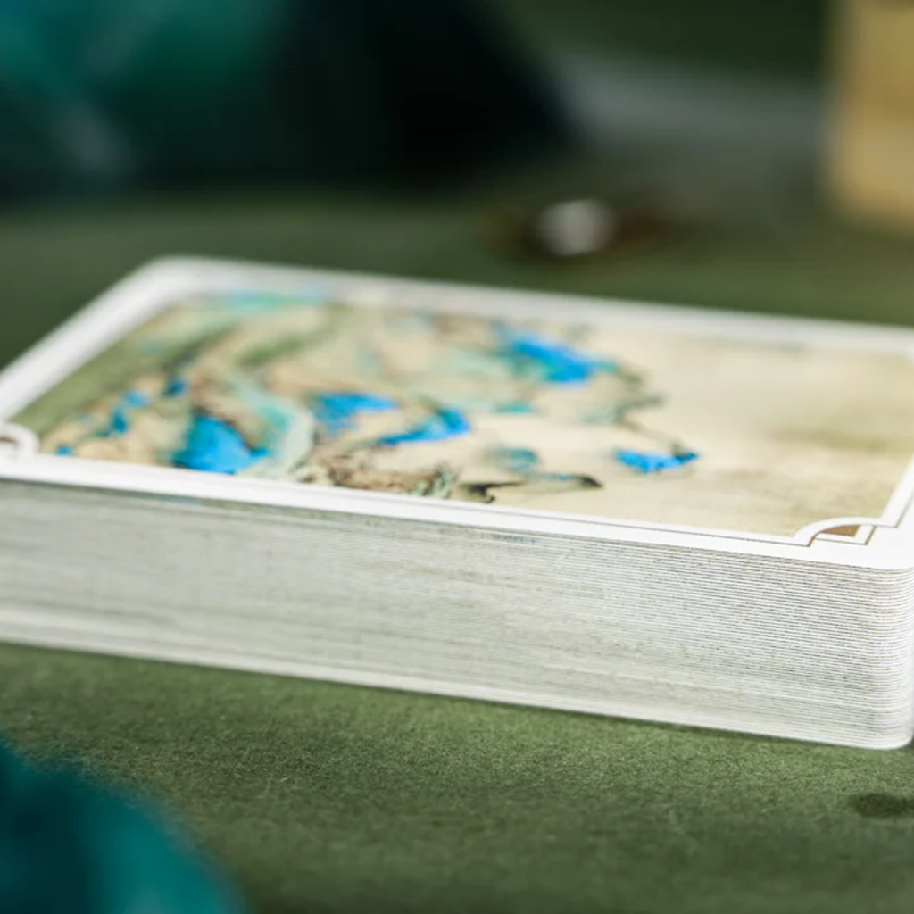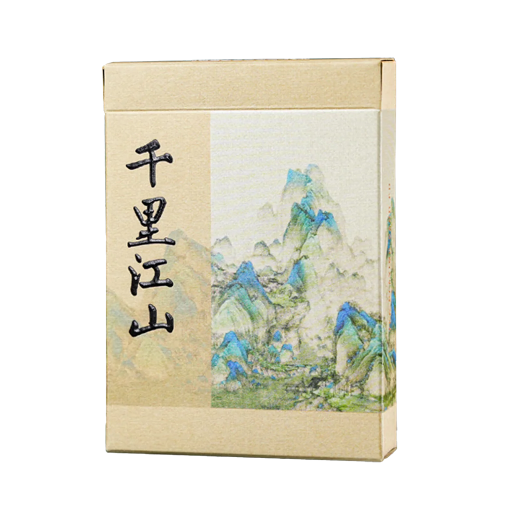 當按順序排列時,每個花色的卡背組合在一起形成一幅完整的山水畫。卡背上的細微皺褶和痕跡呼應了這幅畫作數百年的歷程,喚起獨特而豐富的永恆氛圍。