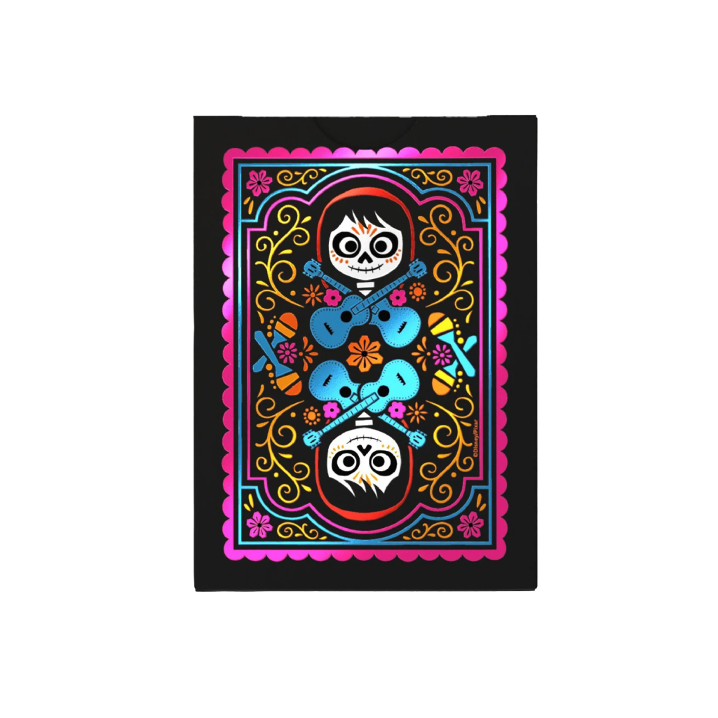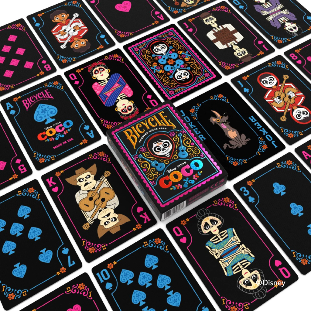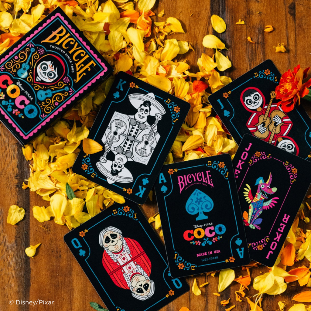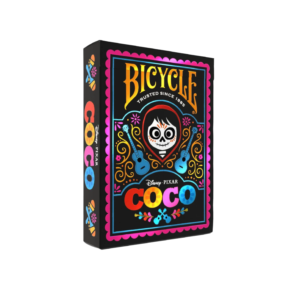 以 Bicycle《可可夜總會》主題撲克牌,重現亡靈節的珍貴回憶。牌盒採用全像燙金工藝,閃耀著如同強大靈獸般繽紛奪目的色彩;人牌則以骷髏造型呈現米高、海特、德拉庫司等眾多角色,細節滿載!