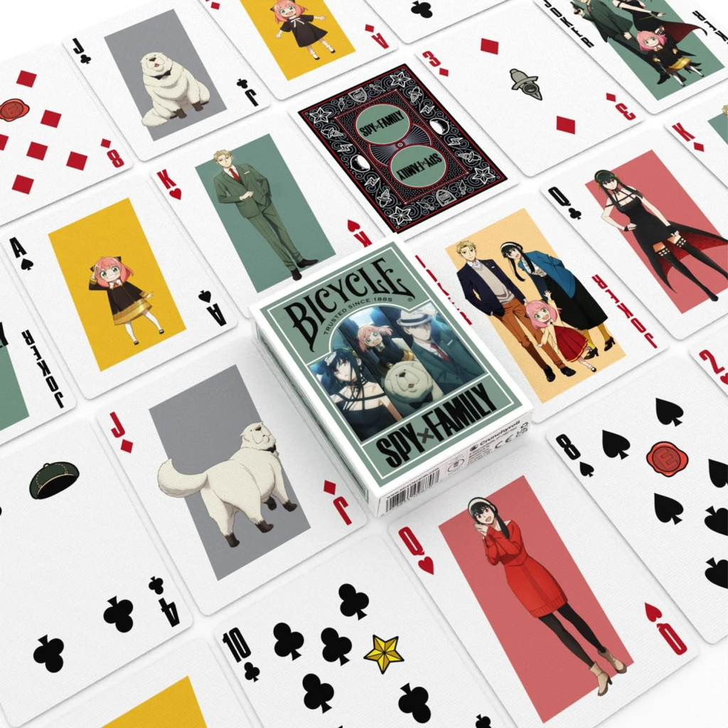 客製化設計的牌背融入了粉絲最愛的動畫系列元素,撲克牌正面則以 Loid、Yor 和 Anya Forger 的精美角色插畫為特色。