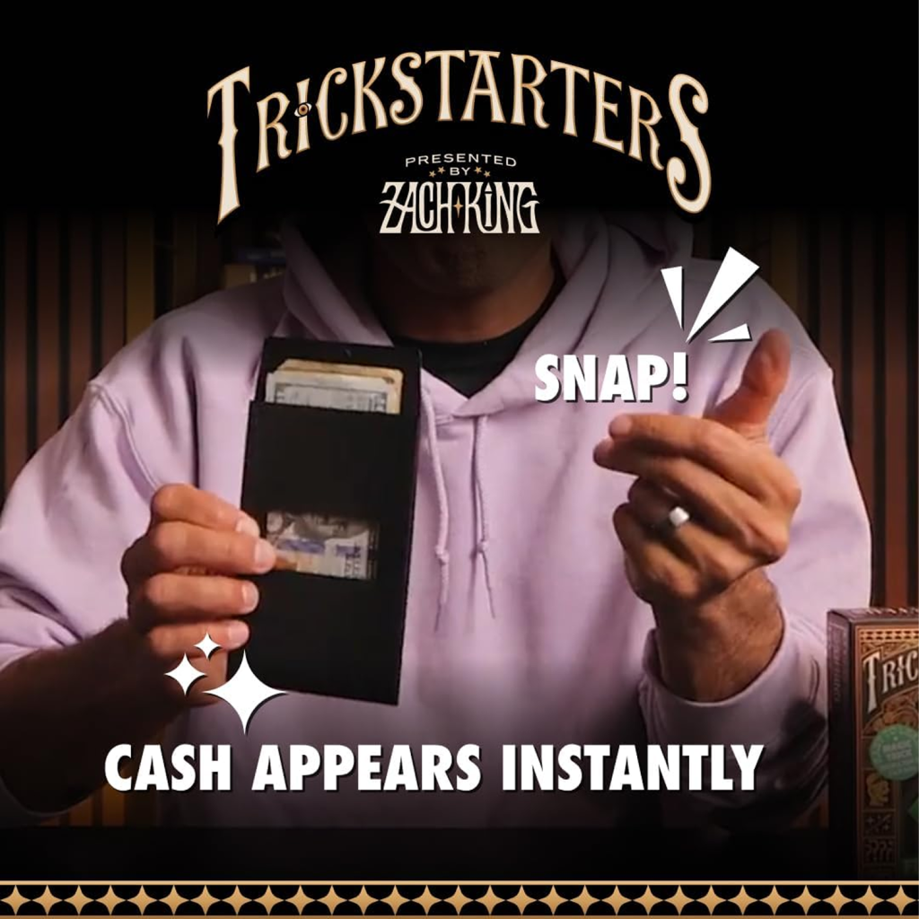 展示一個空空如也的黑色皮夾正反面。僅在眨眼之間,皮夾瞬間裝滿了鈔票!這項魔術發生在電光火石之間,且學習起來非常容易。