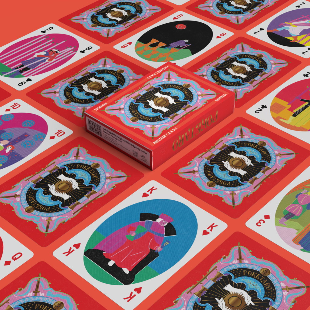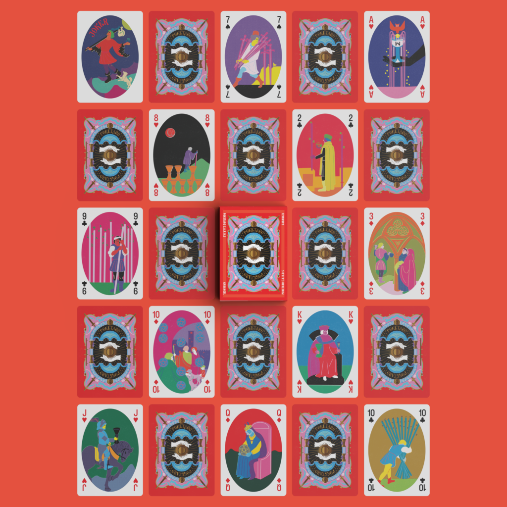 設計使用鮮豔的顏色,並採用了舊式印刷的視覺效果,以全新的方式突出撲克和塔羅這兩種具有歷史意義的卡牌。
