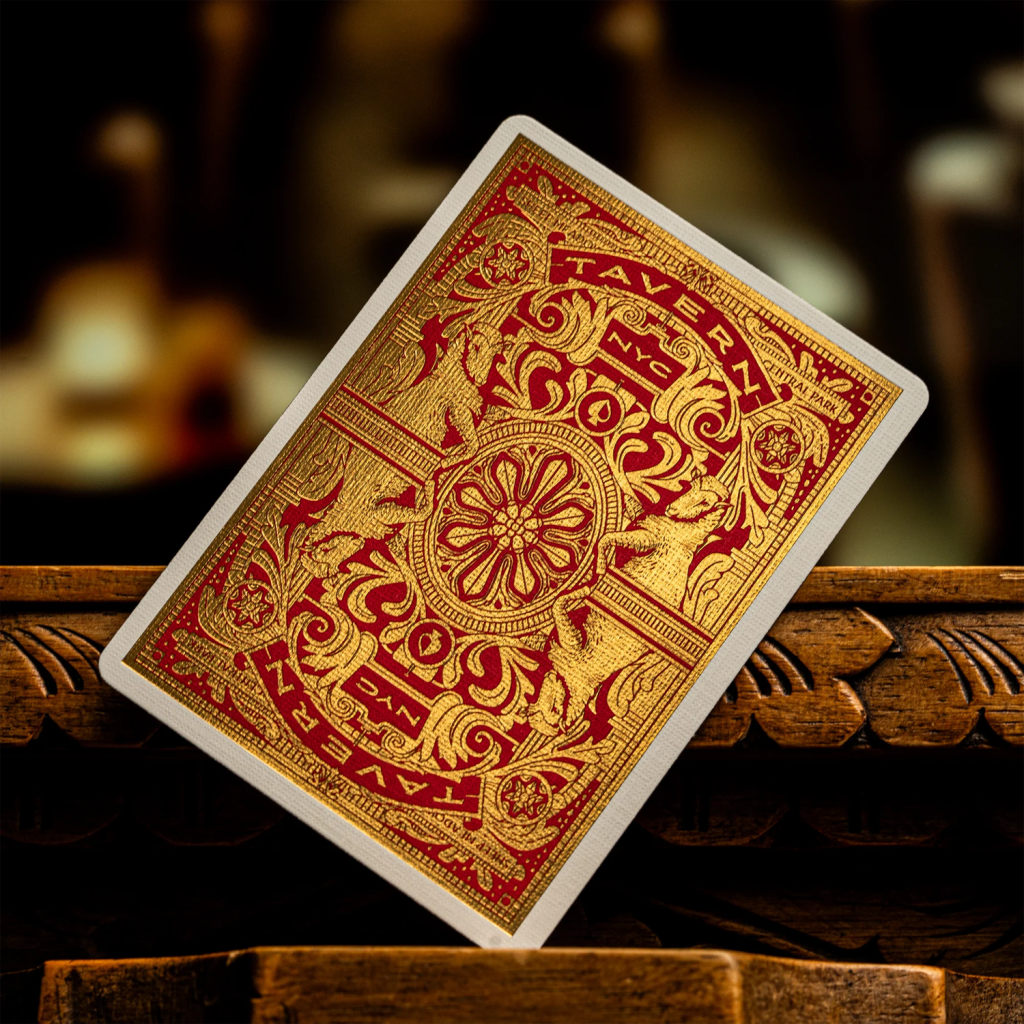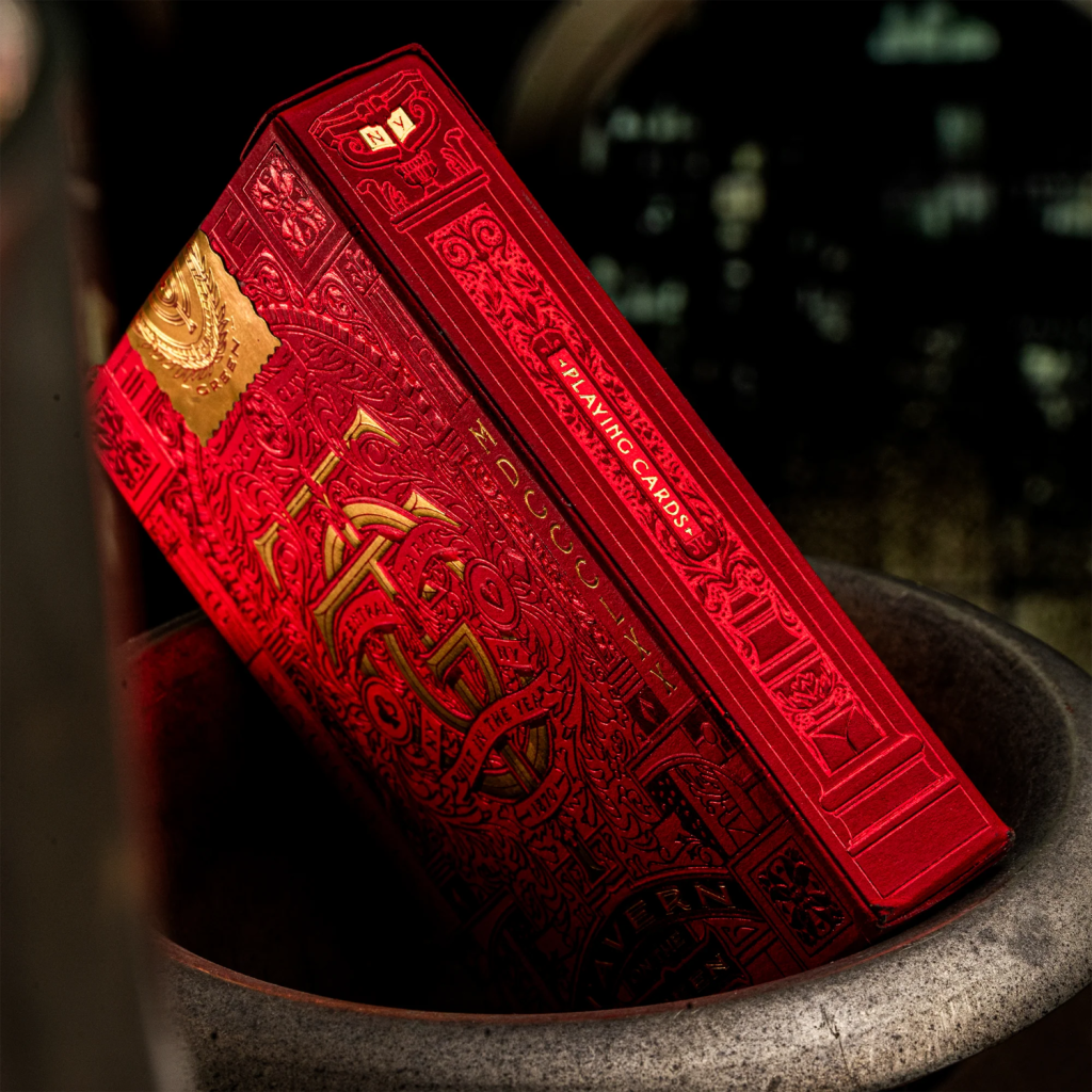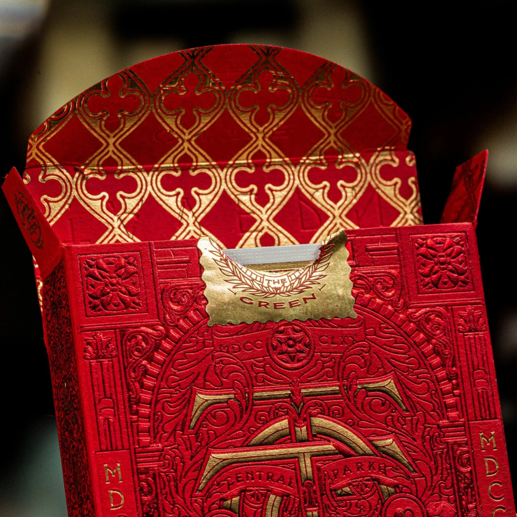 這款全新的 Tavern on the Green 限量版撲克牌,在外盒包裝上採用鮮豔的紅色紙材,並覆以紅金雙色箔紙。其牌盒細節之精緻,堪稱我們歷來生產之最。從裡到外,每一處細節都閃耀著光芒。細膩的壓紋與極致濃郁的箔紙,營造出唯有 Tavern 才具備的獨特氣場。