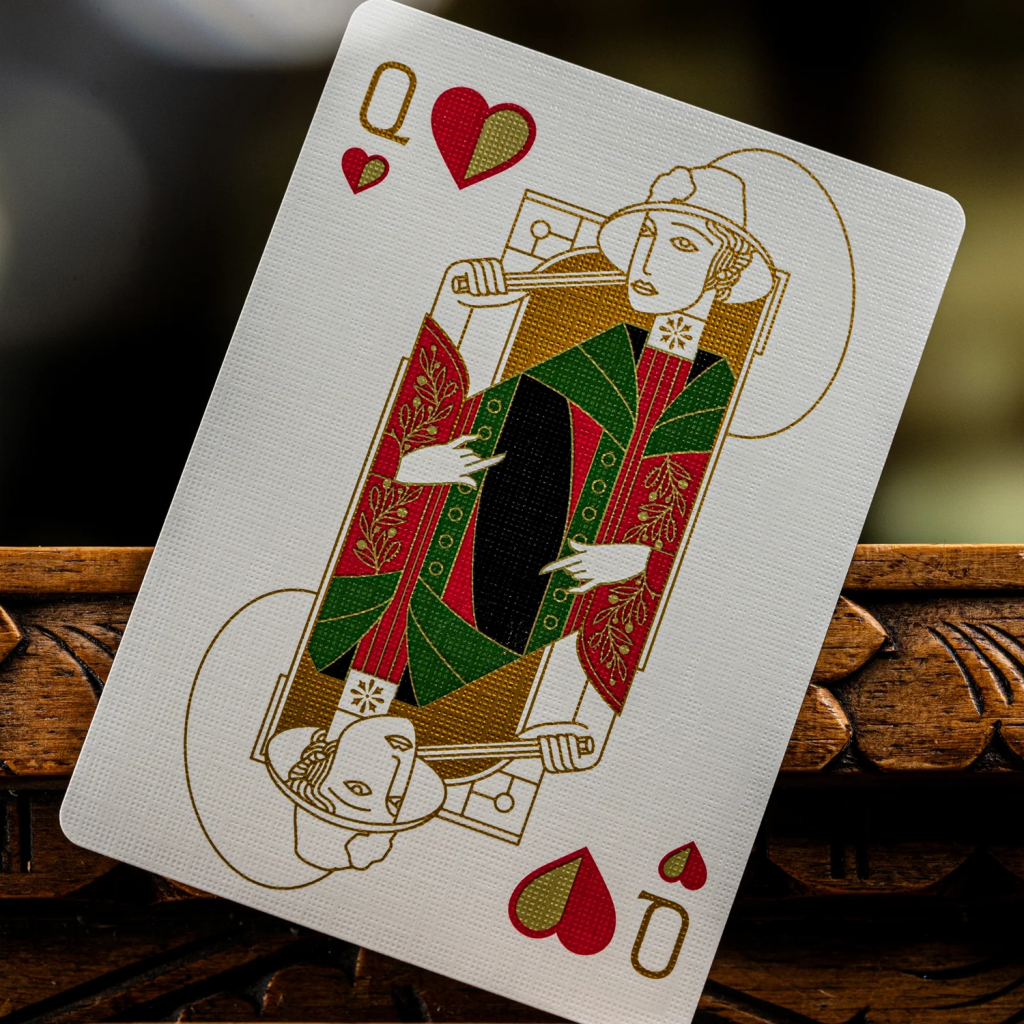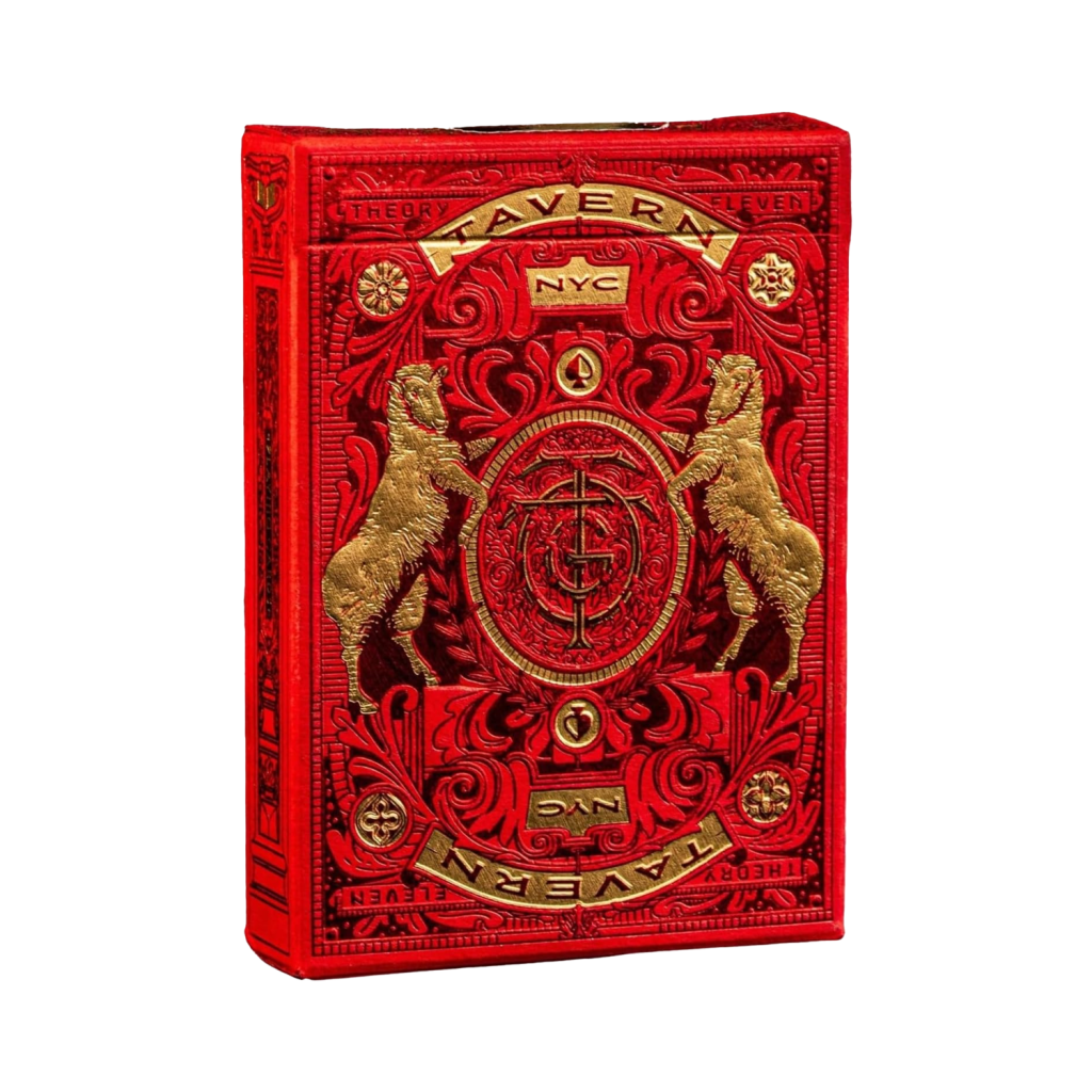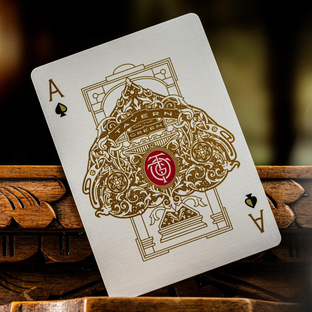這款全新的 Tavern on the Green 限量版撲克牌,在外盒包裝上採用鮮豔的紅色紙材,並覆以紅金雙色箔紙。其牌盒細節之精緻,堪稱我們歷來生產之最。從裡到外,每一處細節都閃耀著光芒。細膩的壓紋與極致濃郁的箔紙,營造出唯有 Tavern 才具備的獨特氣場。