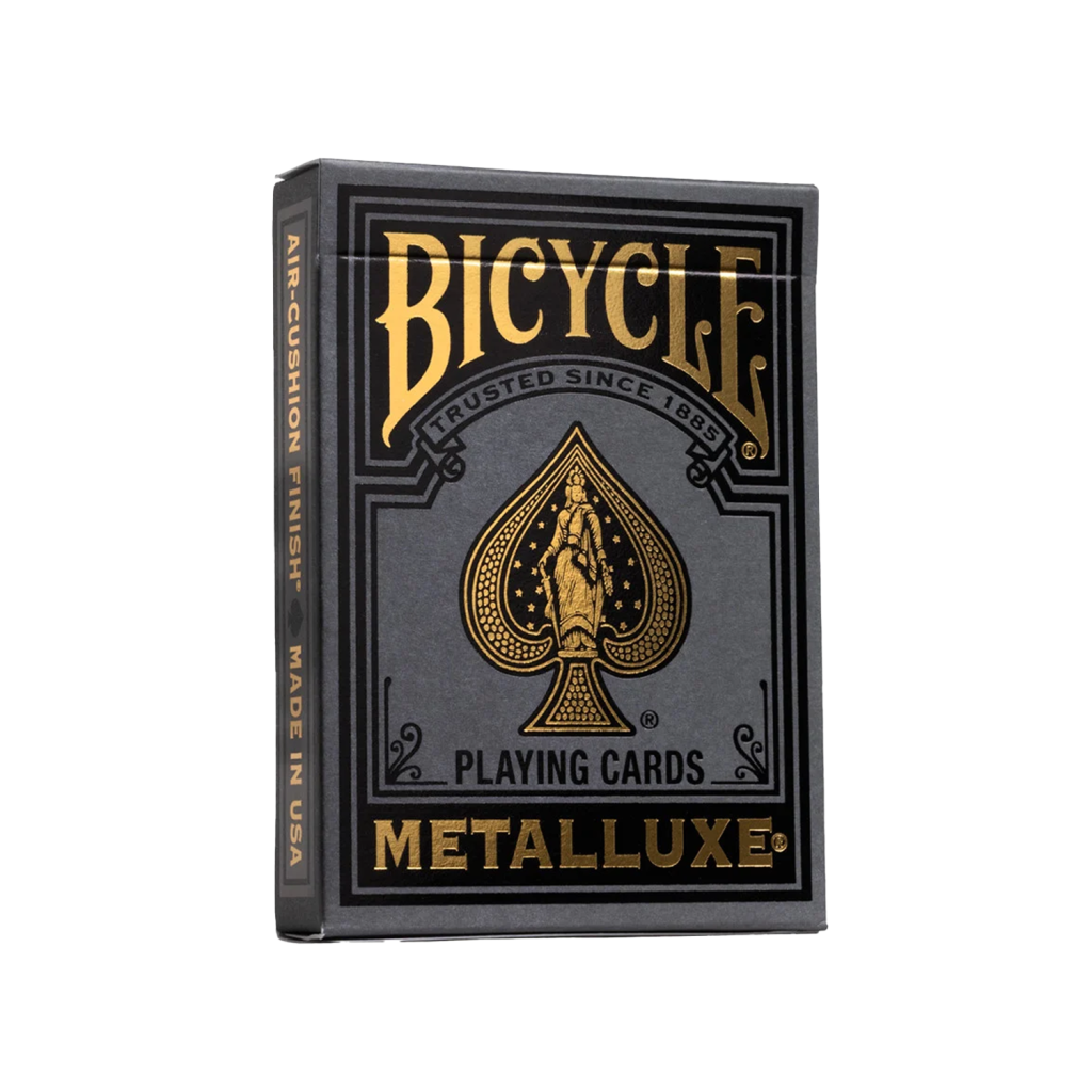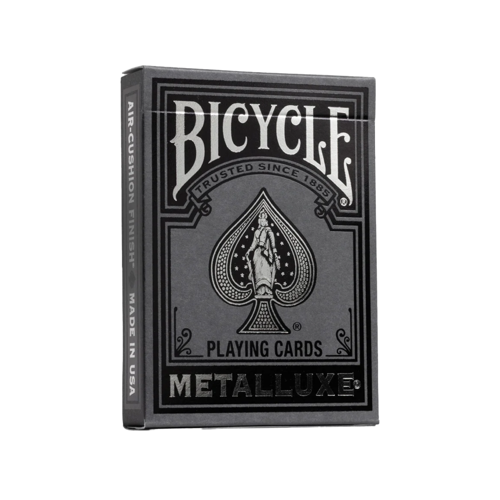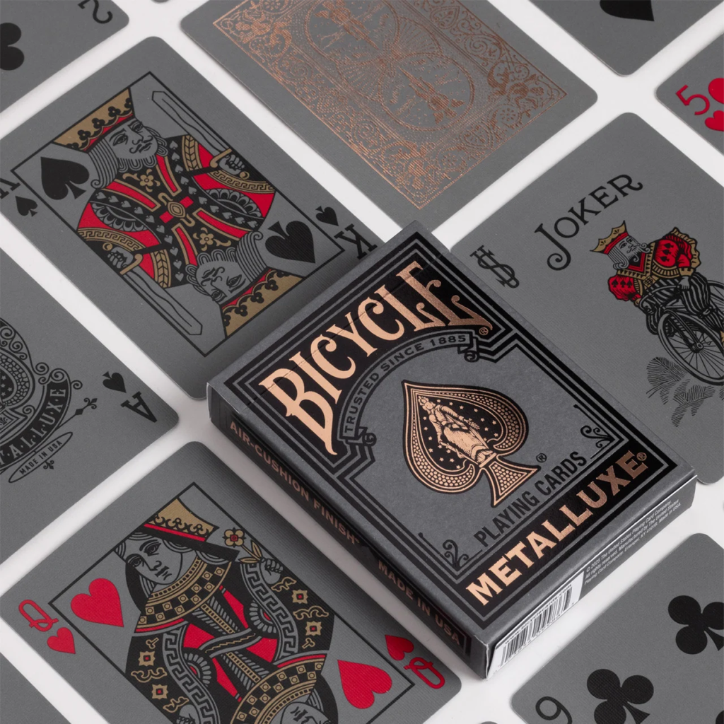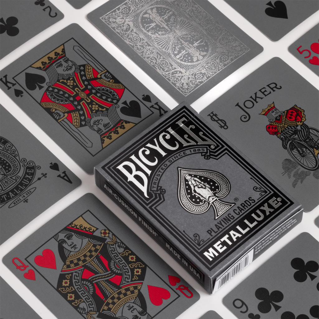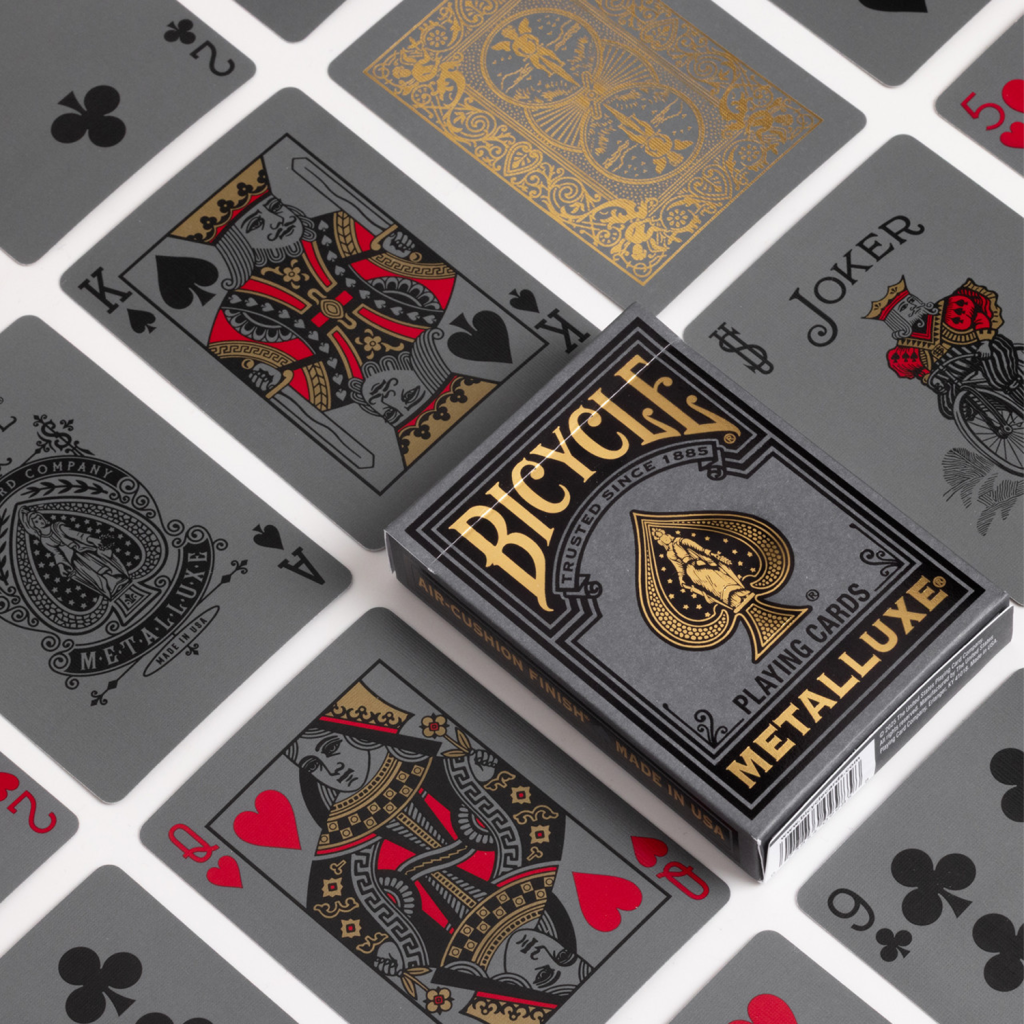 銀色、金色與玫瑰金 Black Metalluxe 牌組,每一款都飾有閃耀的金屬箔,讓每一次洗牌、花式動作與開扇都化為眾所矚目的表演。