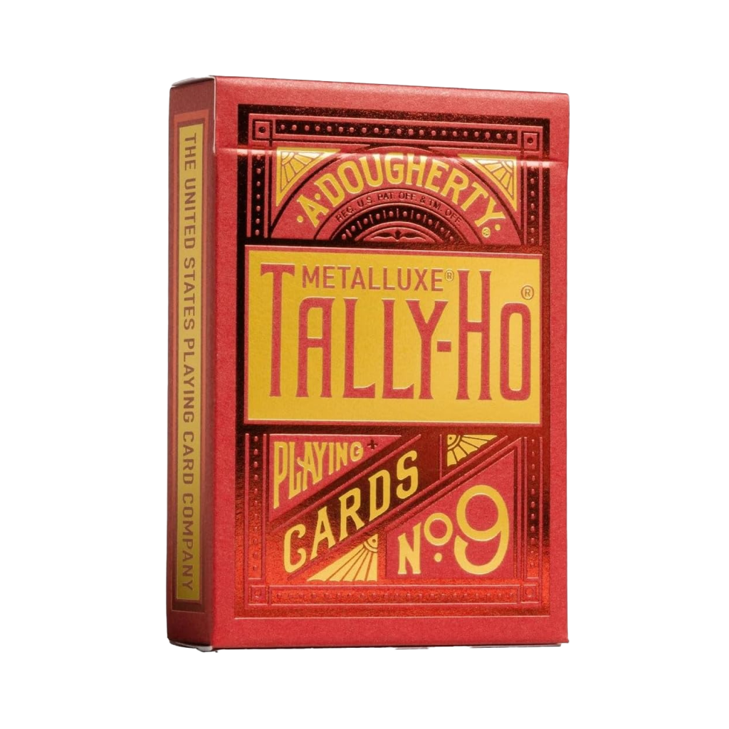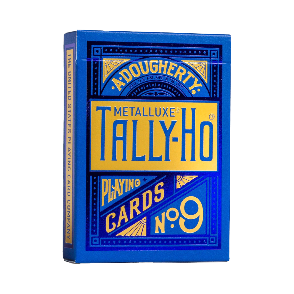 Tally-Ho MetalLuxe® 撲克牌是終極豪華收藏撲克牌。 Tally-Ho MetalLuxe 撲克牌採用經典美麗的 Tally-Ho 圓形牌背面設計,採用收藏版金屬箔。盒蓋和卡背均壓有真正的金屬箔,以實現耀眼的光澤。折疊盒採用美麗、引人注目的寶藍色箔和閃閃發光的金箔,而卡片背面則印有令人驚嘆的藍色箔,打造出經典的 Tally-Ho 圓背設計。