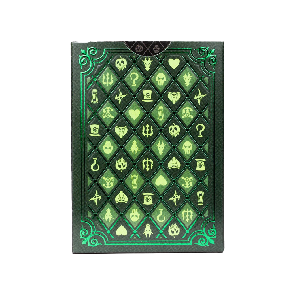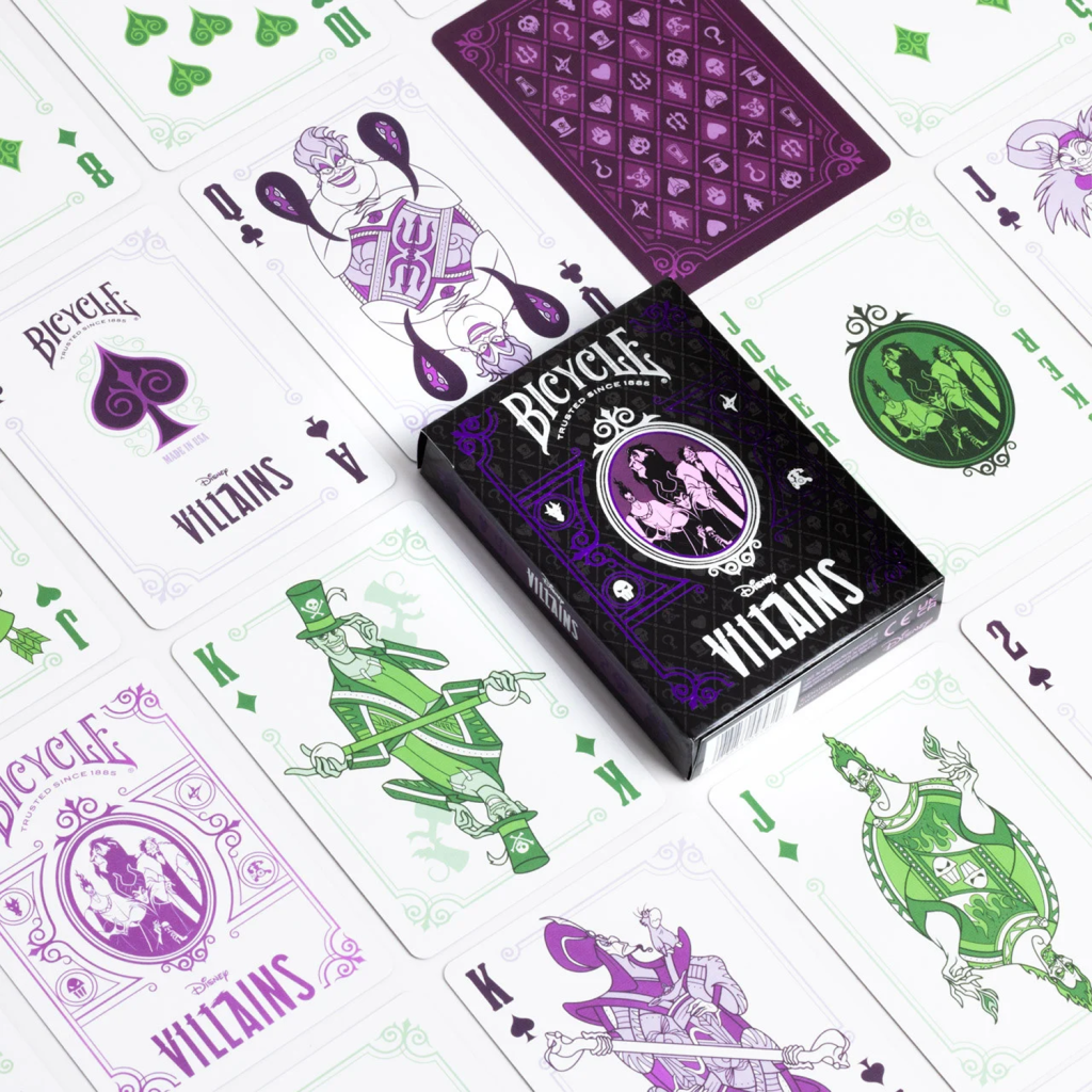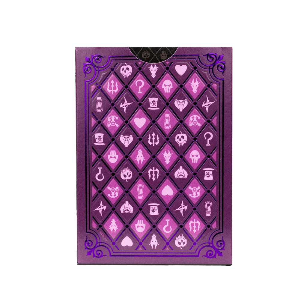 迪士尼反派撲克牌是迪士尼系列中的一款,正面印有四位著名的迪士尼反派角色,牌盒上飾有銀色和紫色箔片。牌面印有12位不同的迪士尼反派角色圖案。